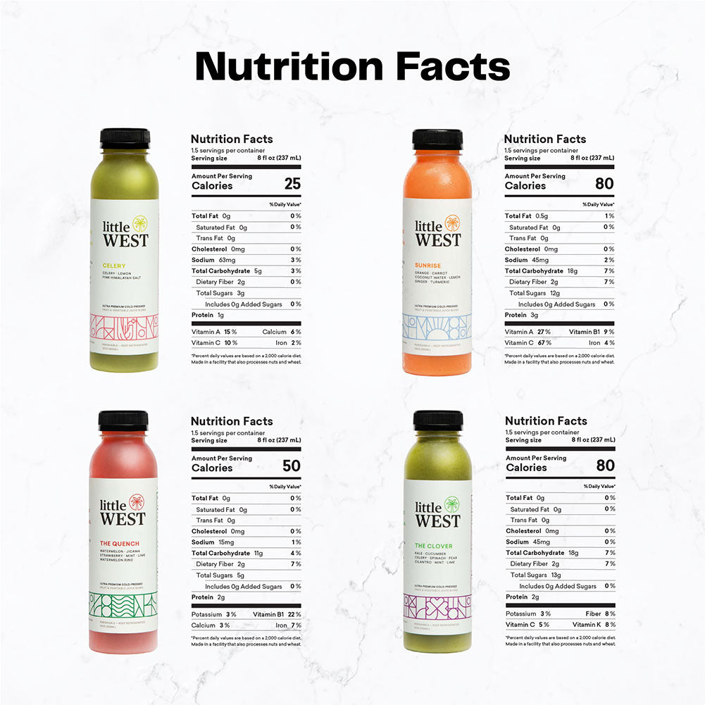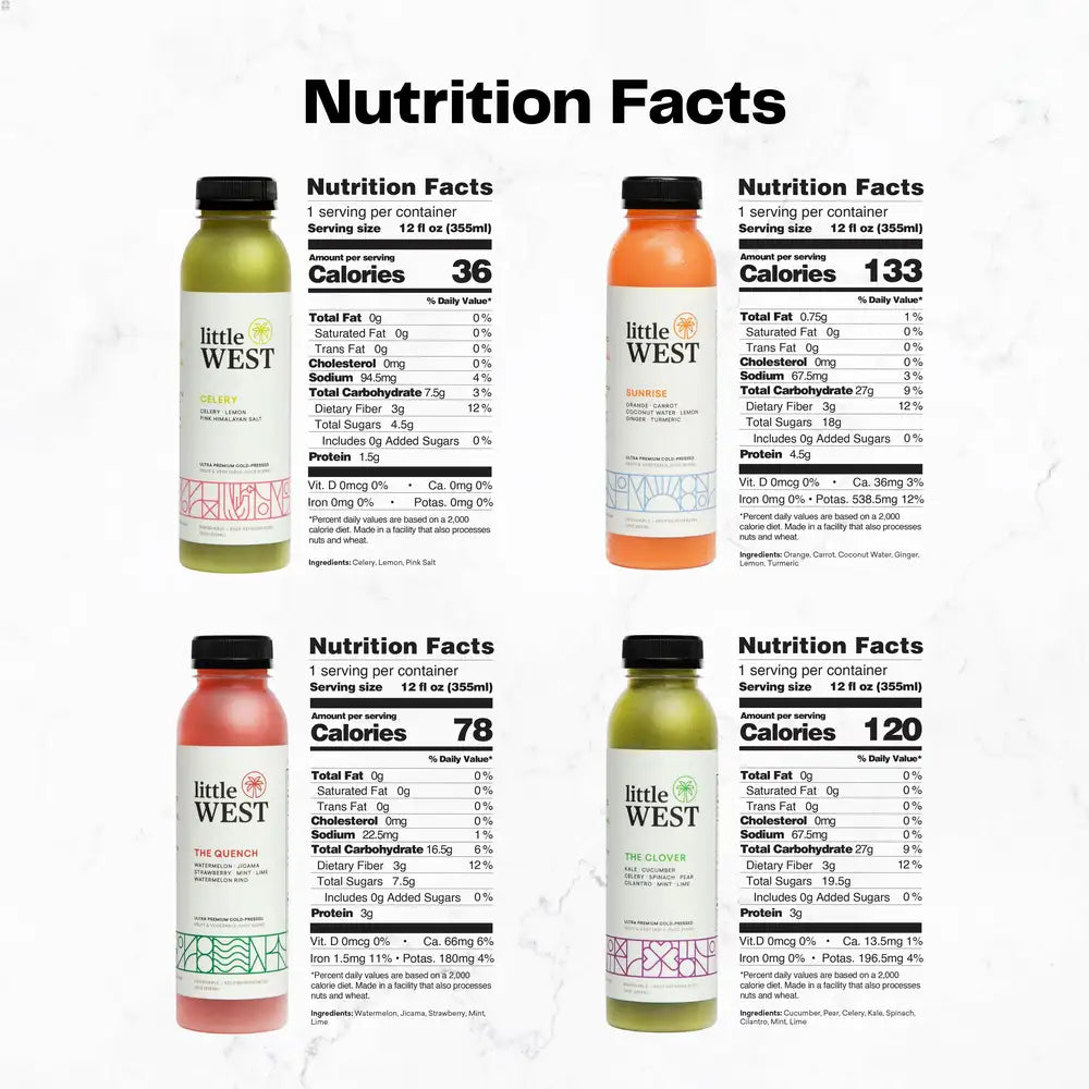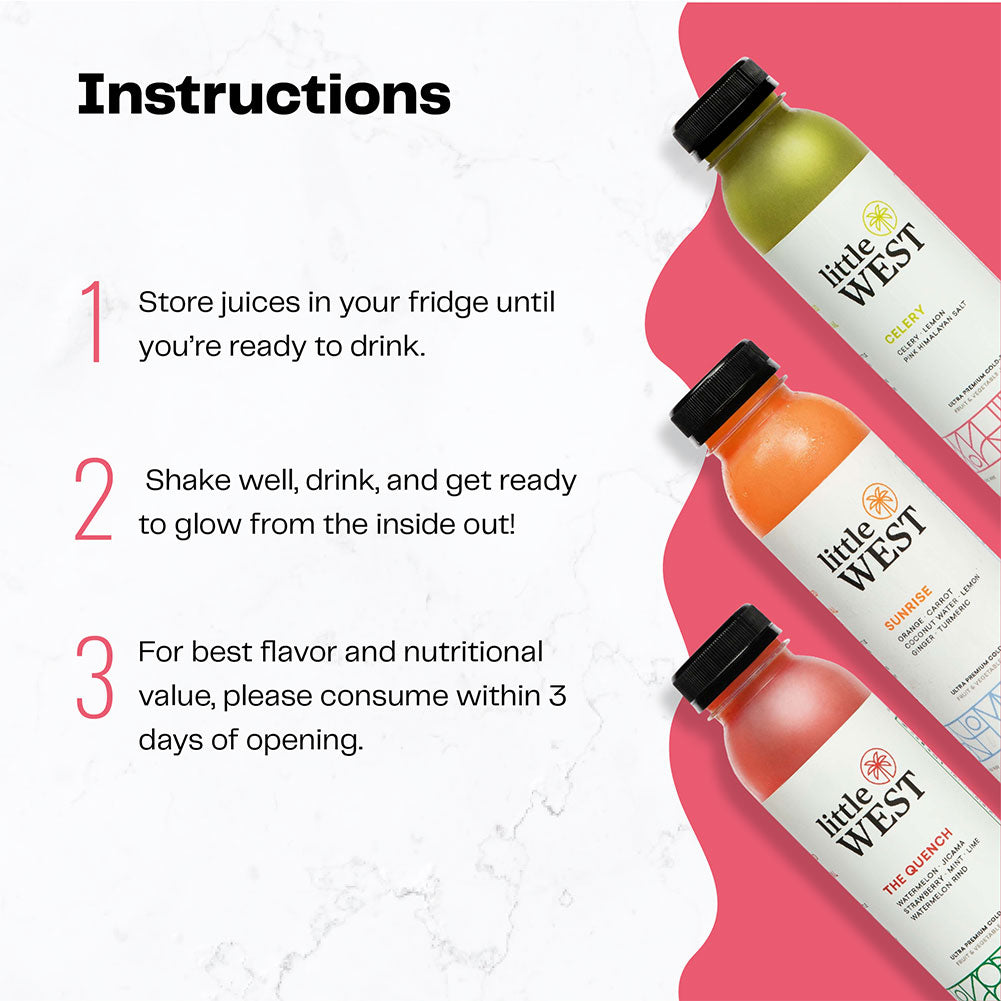 LET IT GLOW. Radiate from the inside out with Little West’s Glowing Skin Kit. The juices in this kit are bursting with vitamin C, vitamin A, lycopene, and other bioactive compounds to promote a clearer, brighter complexion. Try drinking 2 bottles a day for 6 days to boost your hydration and support the body’s natural ability to flush toxins.