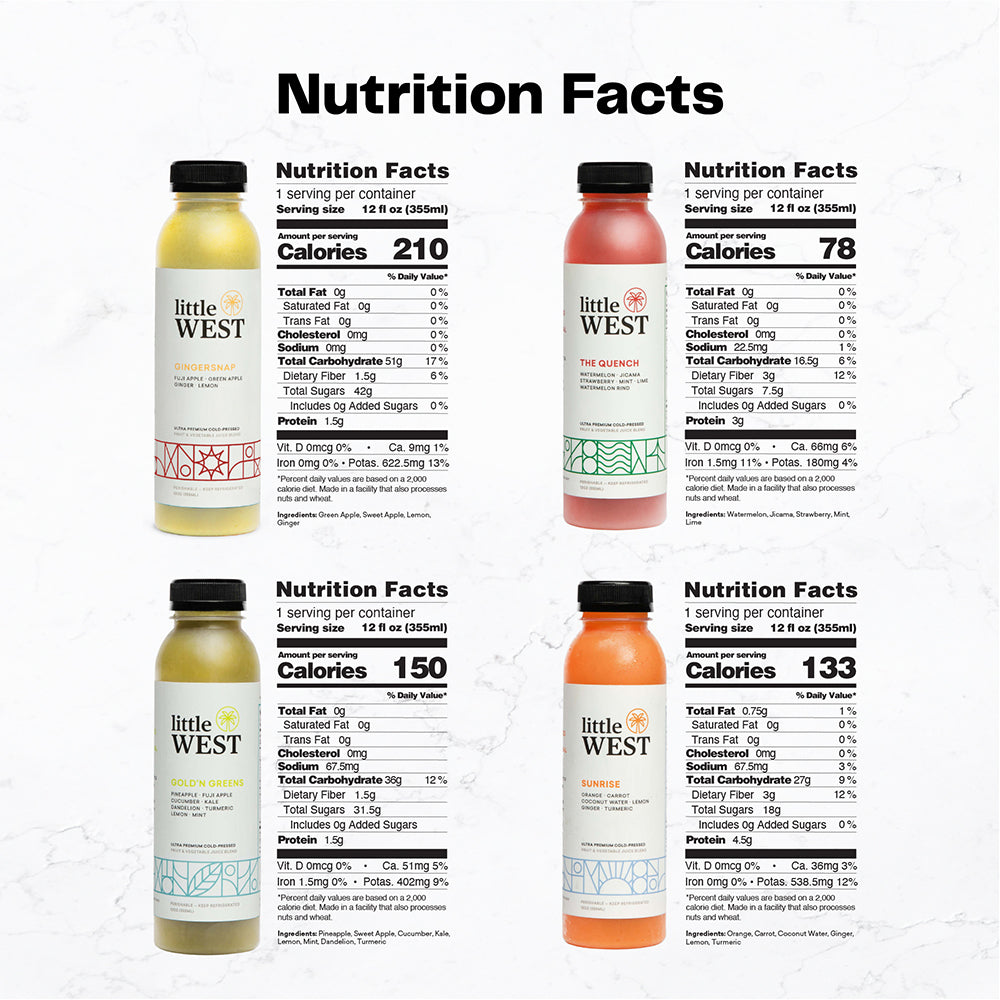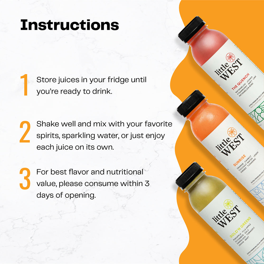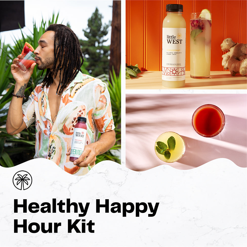 GET HEALTHY, BE HAPPY. Little West’s Healthy Happy Hour Kit includes 14 cold pressed juices that make perfect mixers for your next cocktail (or mocktail) party. Get creative and add a nutritious, flavorful twist to your favorite drinks! 100% real juice with no added sugars, concentrates, preservatives, or anything artificial.