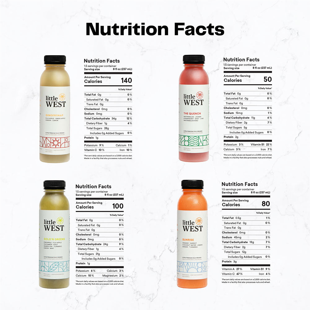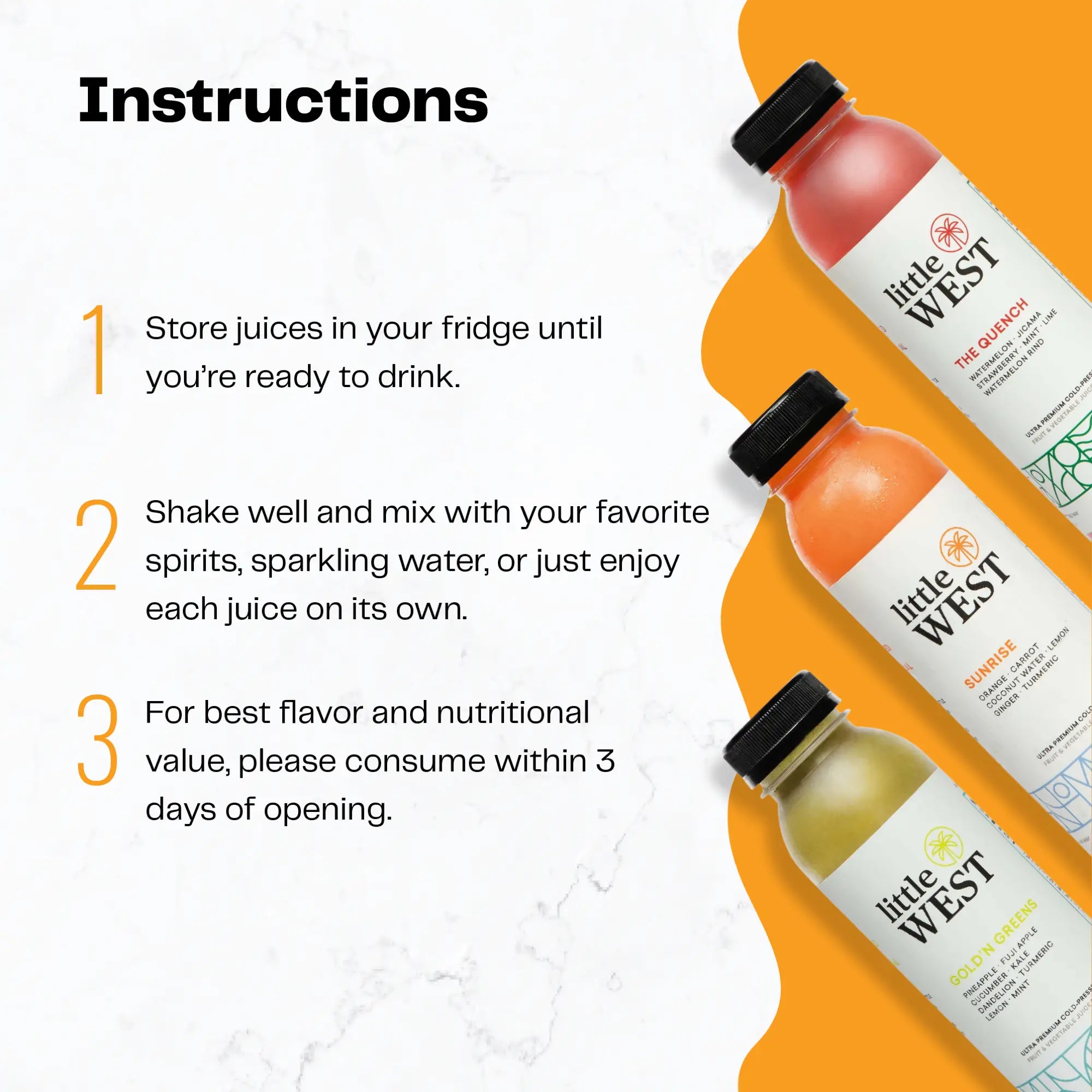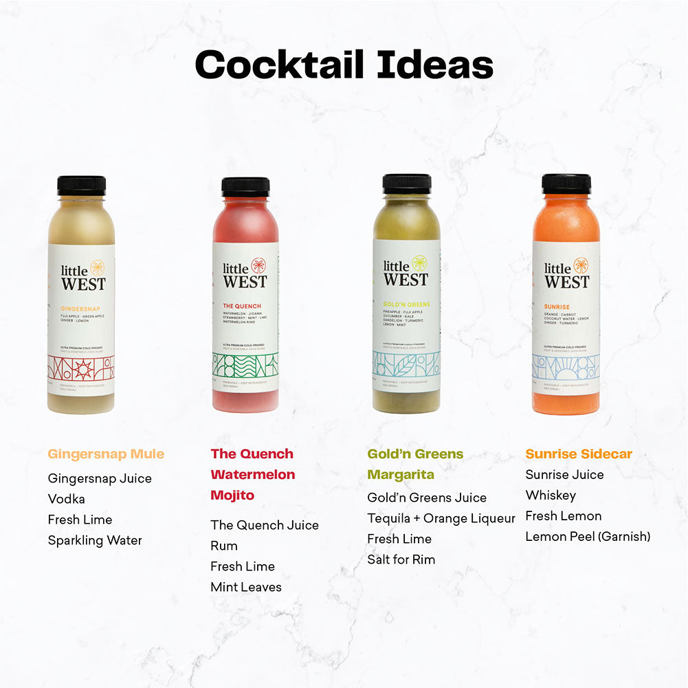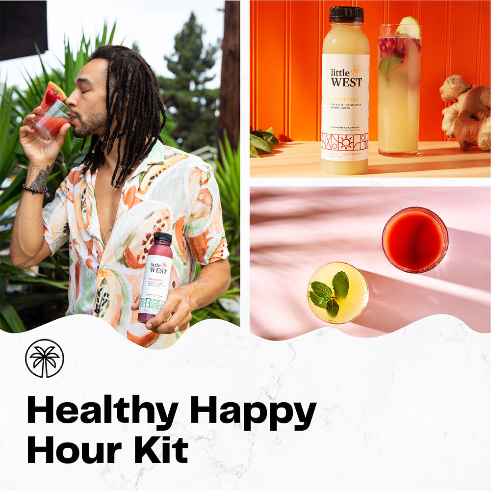 GET HEALTHY, BE HAPPY. Little West’s Healthy Happy Hour Kit includes 14 cold pressed juices that make perfect mixers for your next cocktail (or mocktail) party. Get creative and add a nutritious, flavorful twist to your favorite drinks! 100% real juice with no added sugars, concentrates, preservatives, or anything artificial.Key Info